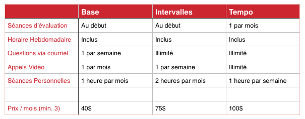 - Niveau Ironman/ultra-marathon – Même que Tempo mais pour 12 mois minimum, à 80$ par mois. Ceci inclus une planification de l’année entière pour en arriver à un événement majeur tel un triathlon ironman, et se doit d’inclure plusieurs autres événements préparatoires (sprints, demi-marathons, marathon, demi-ironman, etc.).